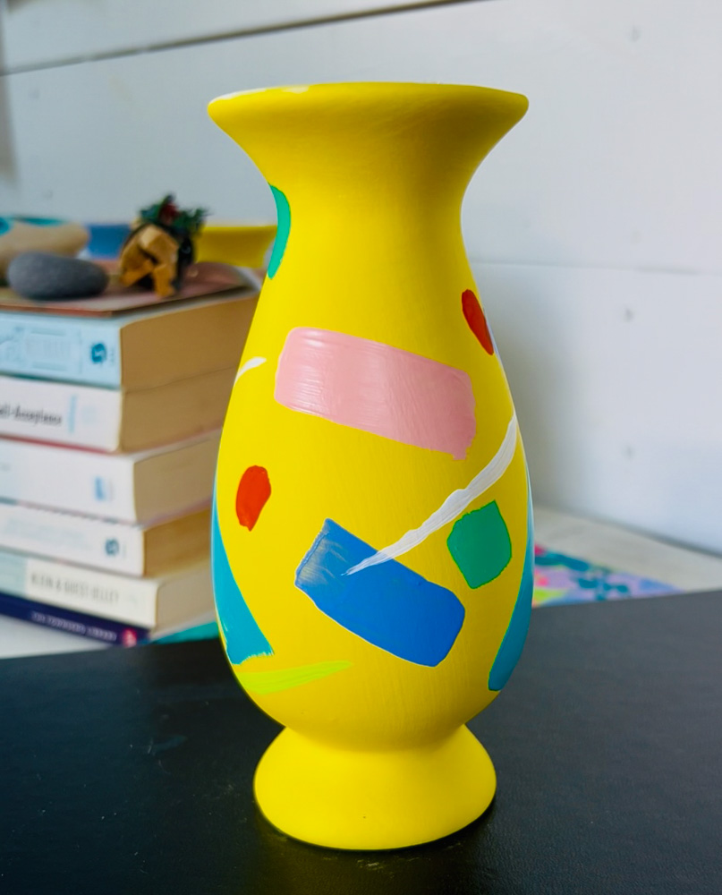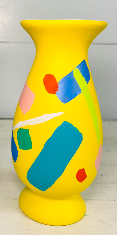 A 5” inch ceramic vase hand-painted in an abstract style with pops of aqua, blue, green, pink, orange, and white on a bright yellow background.