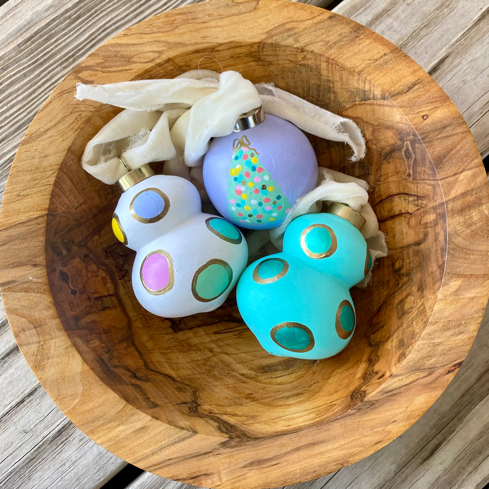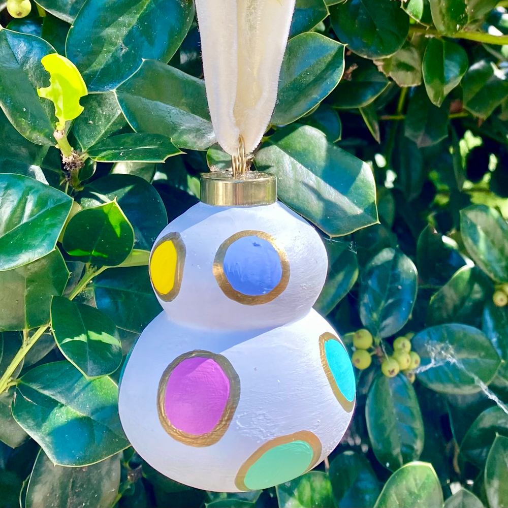 A 3.5” retro finial ceramic ornament with a cream 2” velvet ribbon featuring a white background with pink, purple, mint, tropical green, and yellow polka dots outlined in gold. Hand-painted with acryla gouache and acrylic paint.