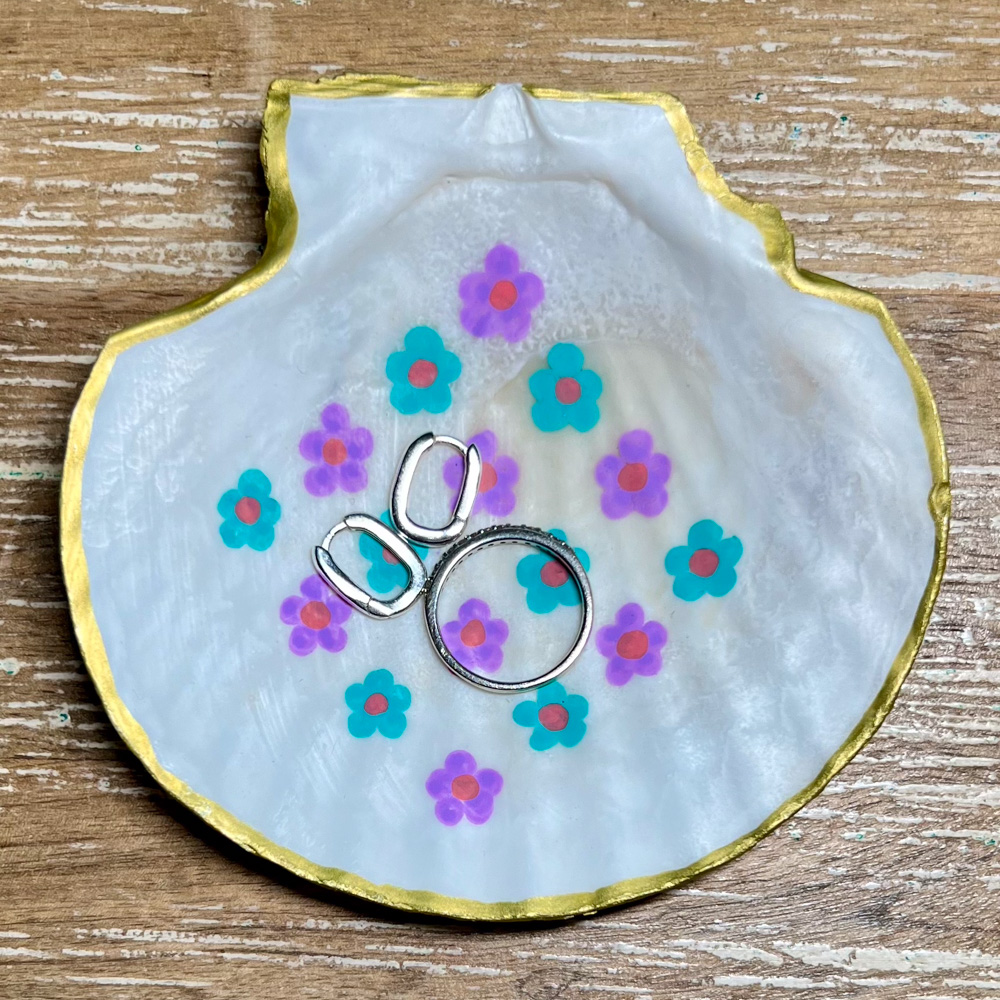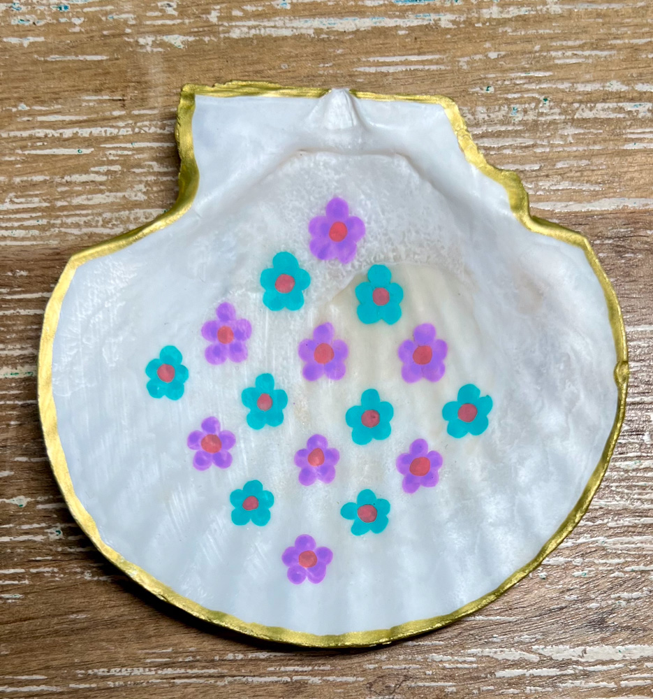 A 3-4” scallop shell repurposed as a trinket dish featuring purple and aqua daisies stacked in a diamond shape with a gold rim.