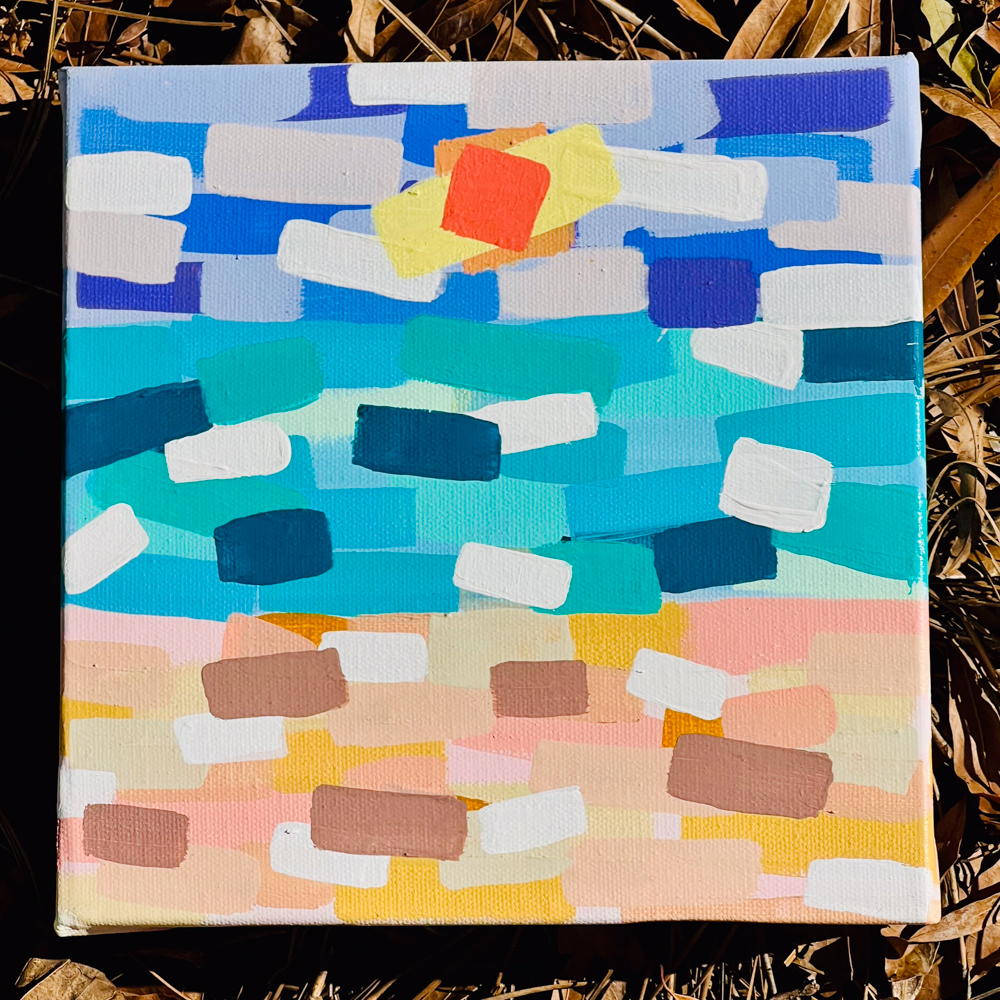 An 8x8x1.5-inch gallery-wrapped canvas featuring a modern landscape. Brisk paintbrush strokes in blues, purples, aquas, teals, creams, pinks, yellows, and white depict a sunny day at the beach.  Painting continues on sides