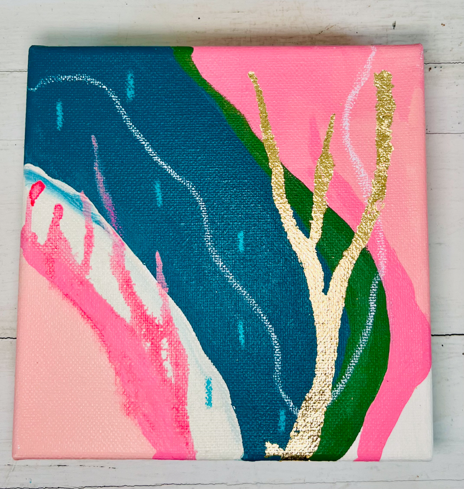 A 6x6x1.5” abstract acrylic and mixed media featuring gold leaf and pink sprouts, white squiggly sprigs, aqua droplets, and a peach, teal, green, pink and cream background.