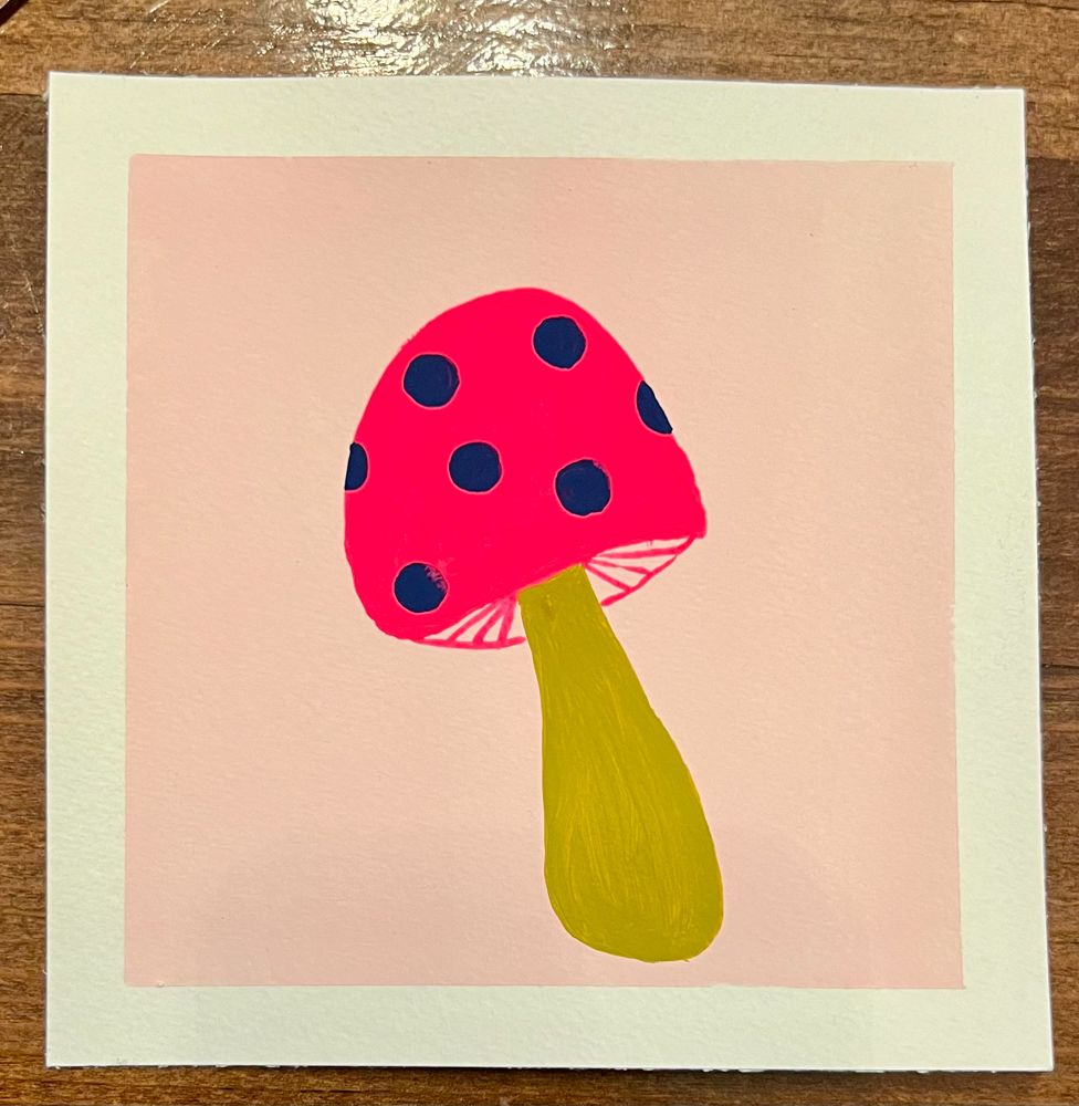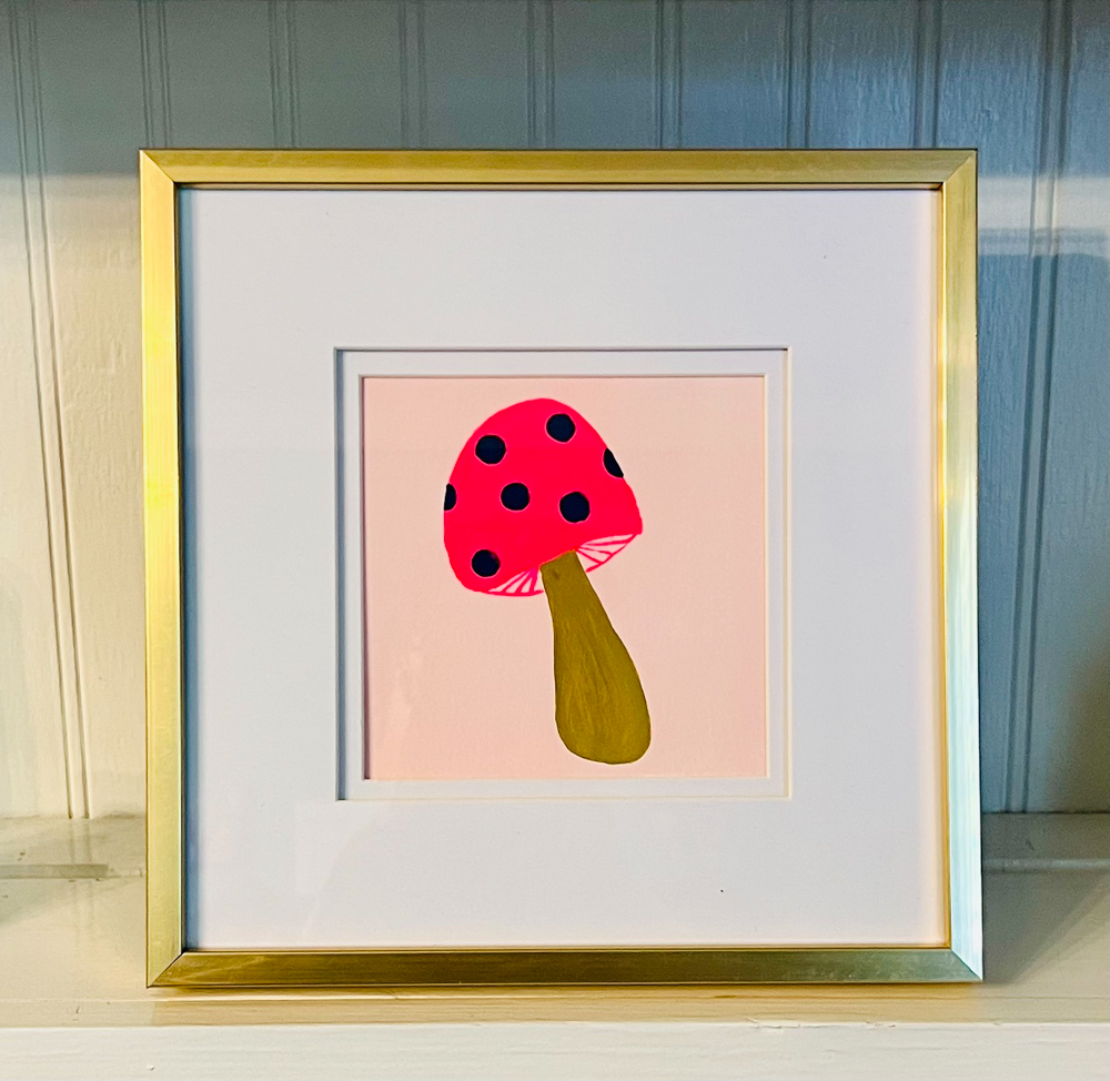 A 5×5 acrylic gouache hot pink mushroom with blue spots and an olive green stalk with a pale pink background double matted in a 8×8” gold frame.