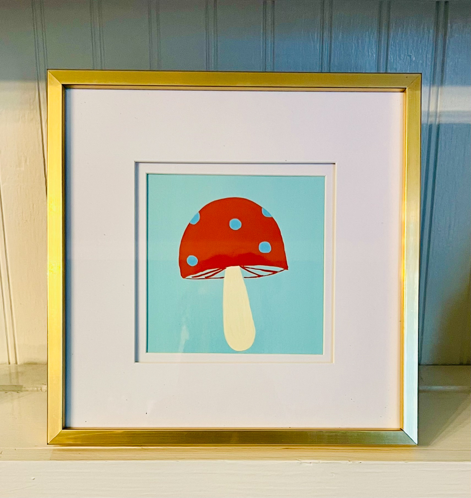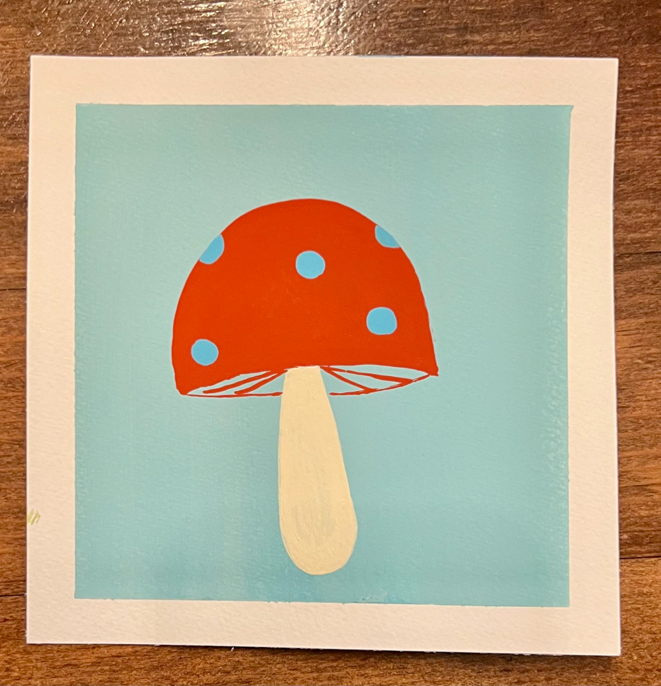 A 5×5 acrylic gouache red mushroom with light blue spots and a cream stalk with a light blue background double matted in a 8×8” gold frame.