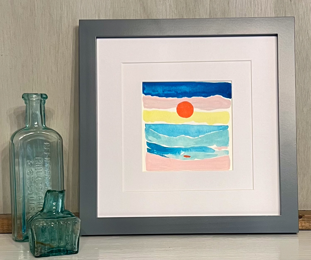 A 4×4 acrylic gouache water landscape on a sunny day in blues, yellow, green, and tan with a wide double mat in a 8×8” natural frame.
