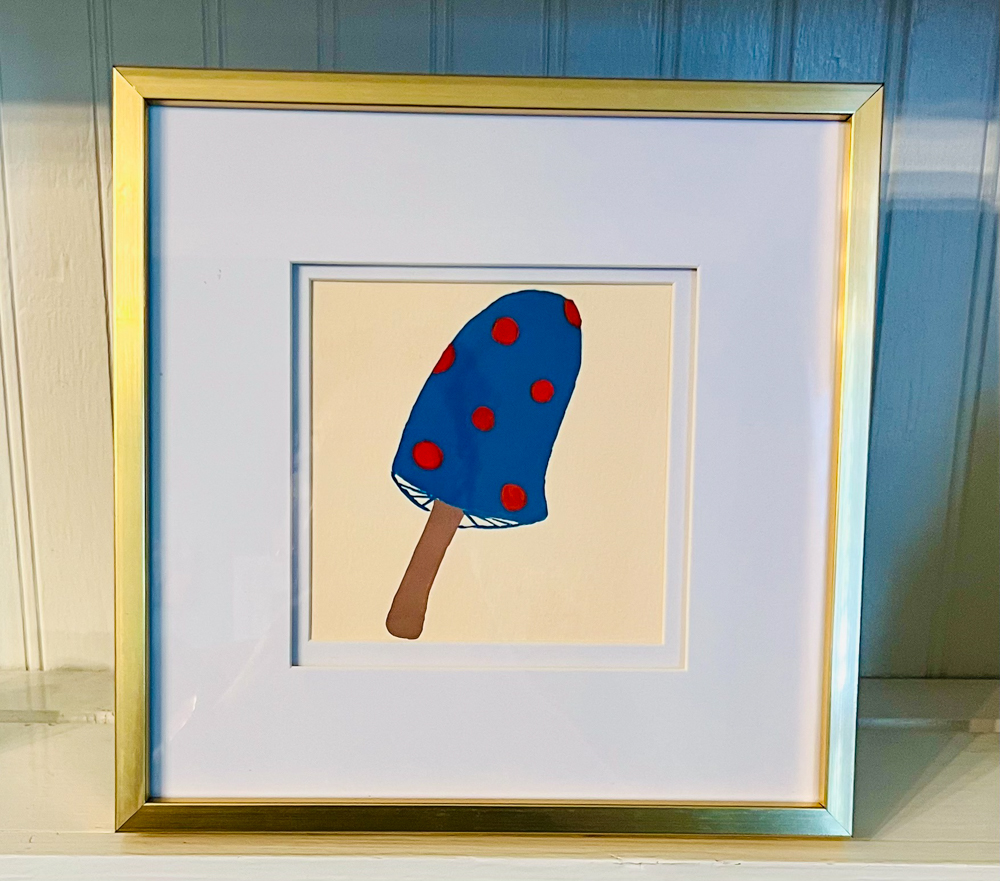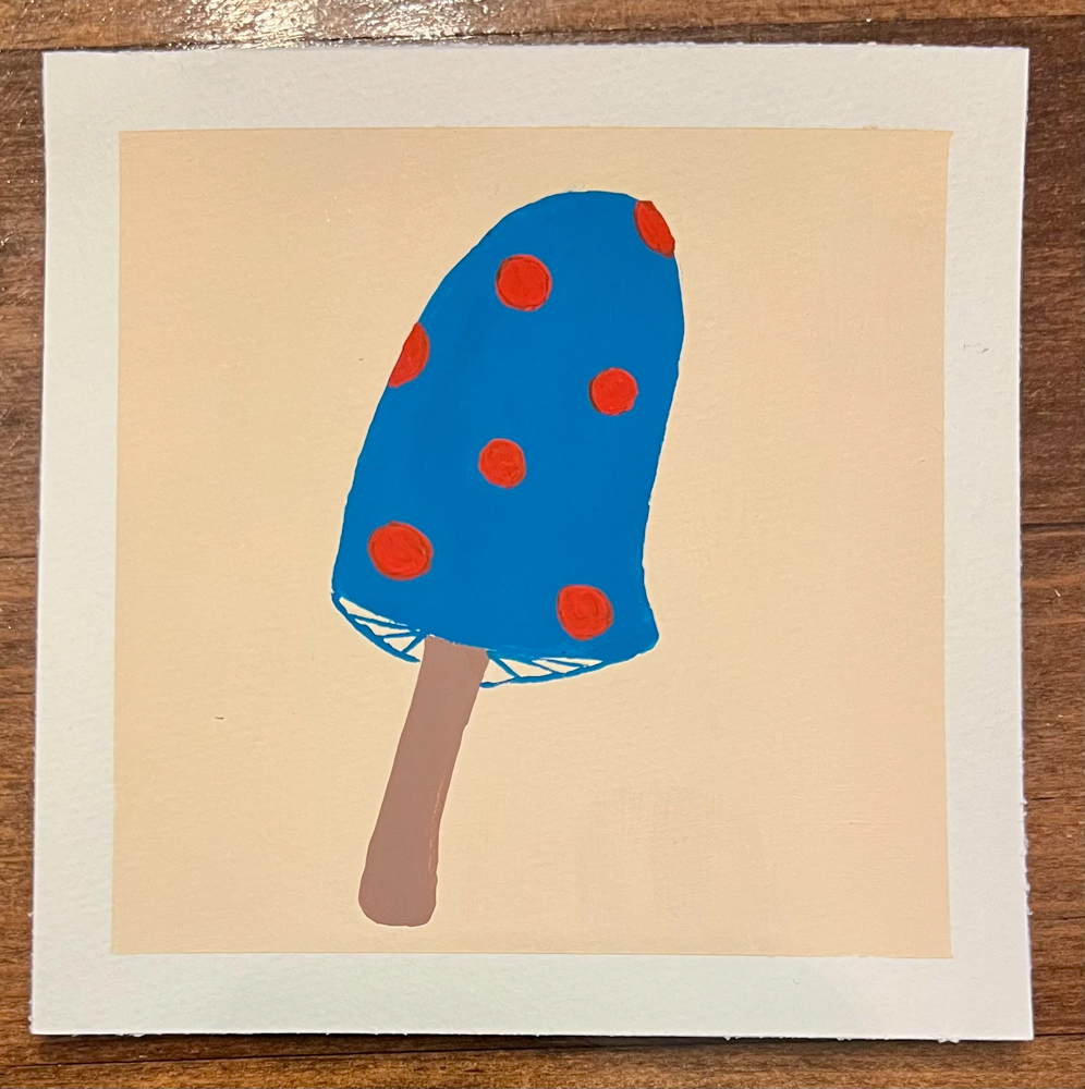 A 5×5 acrylic gouache teal mushroom with red spots and a light brown stalk with a cream background double matted in a 8×8” gold frame.