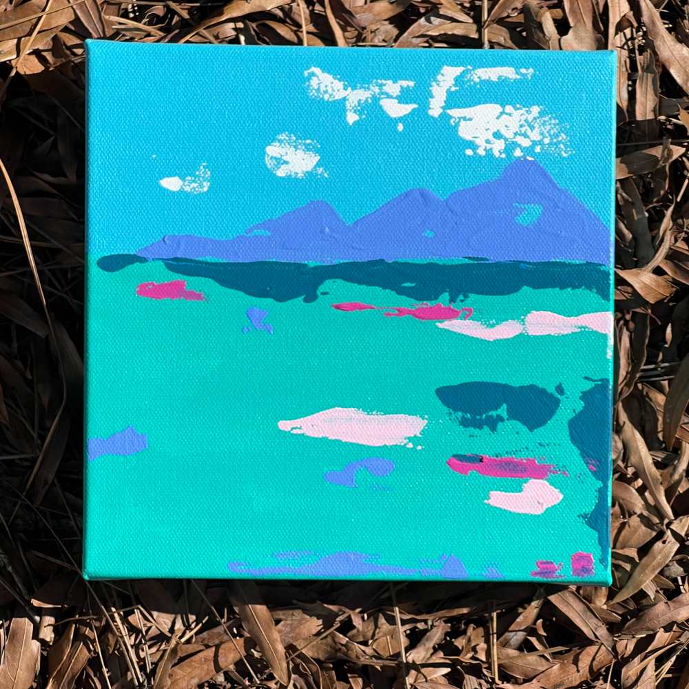 An 8x8x1.5-inch gallery-wrapped canvas featuring an abstracted palette knife landscape in blue and aqua with blue violet mountains, white clouds with accents in pinks and teal.