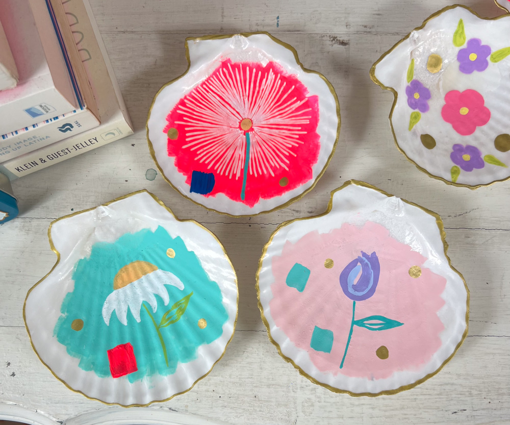 A 3-4” scallop shell repurposed as a trinket dish featuring a pink background with a purple tulip and gold and ice green accents and a gold rim.