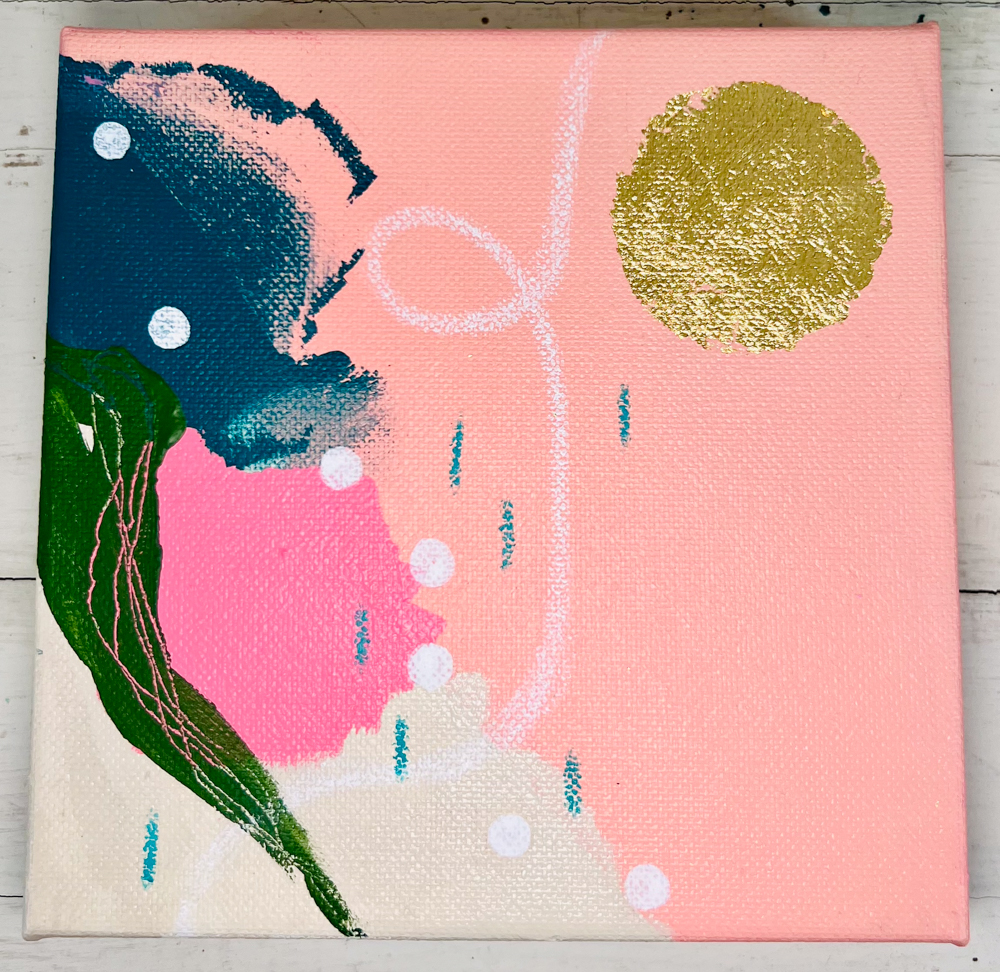 A 6x6x1.5” abstract acrylic and mixed media painting featuring a gold leaf sun, a white squiggly line reminiscent of a contrail, and a peach background with teal, green, pink, and cream accents.