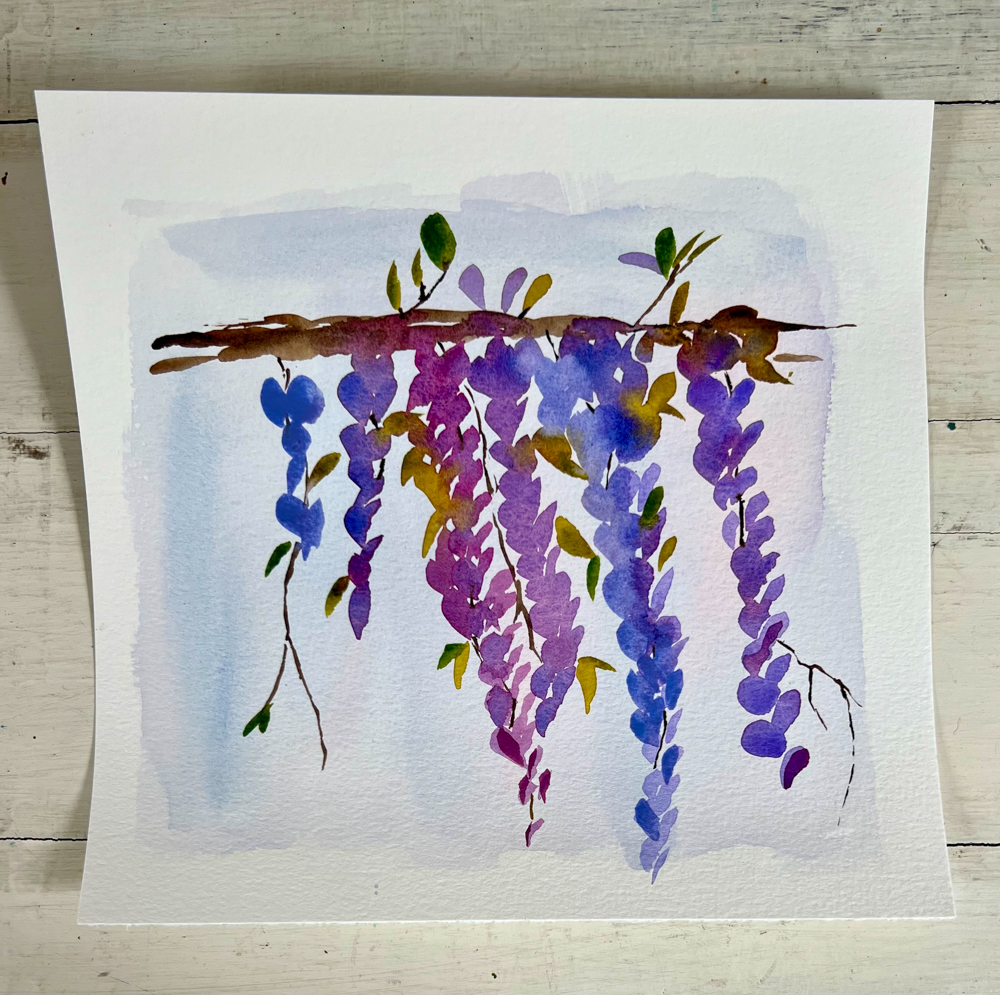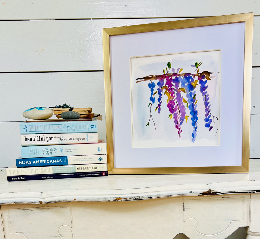 An 8×8” watercolor painting of wisteria in a 12X12” gold frame with a wide mat.